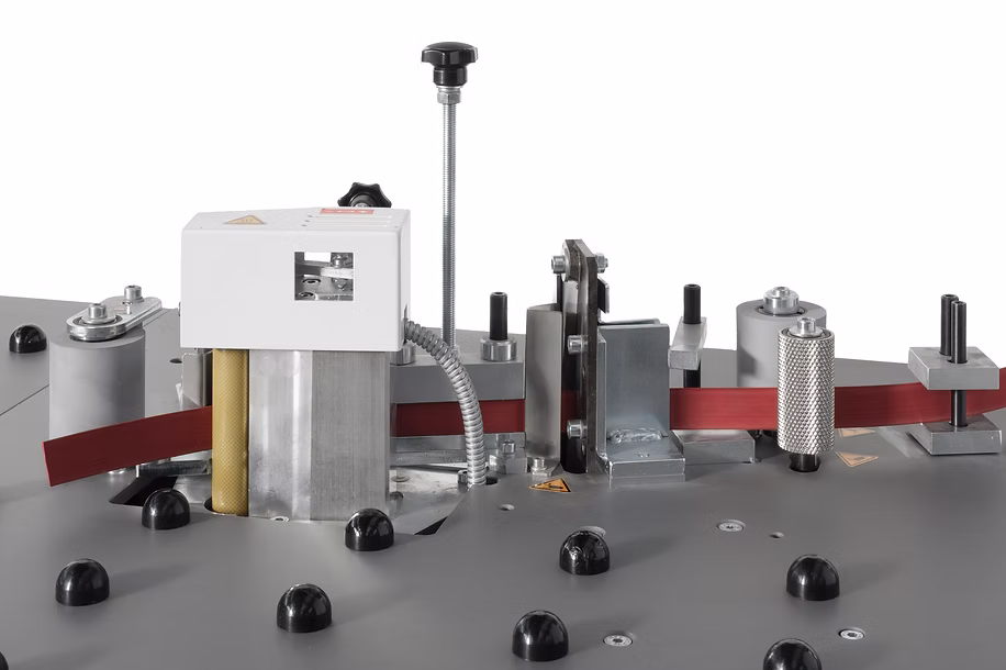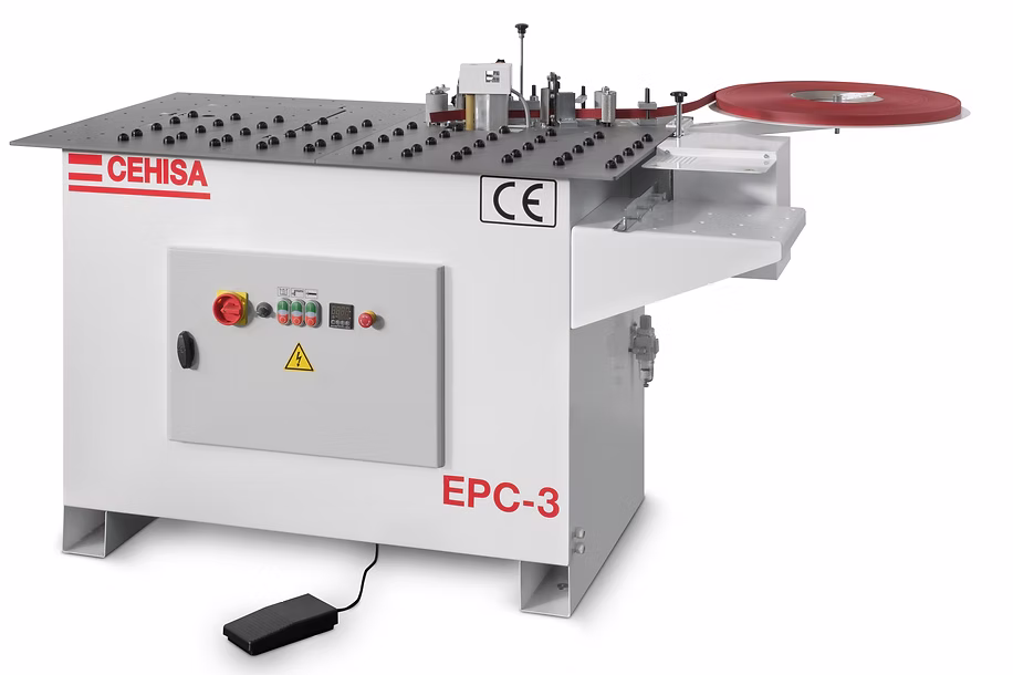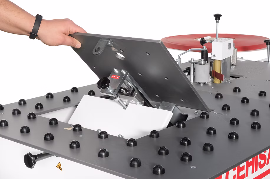 Bordatrice semiautomatica con applicazione di colla a caldo direttamente sul bordo.